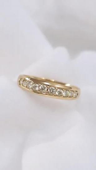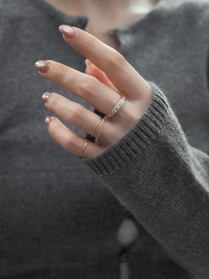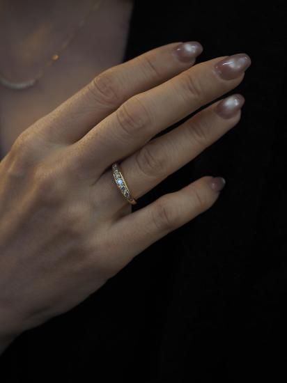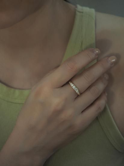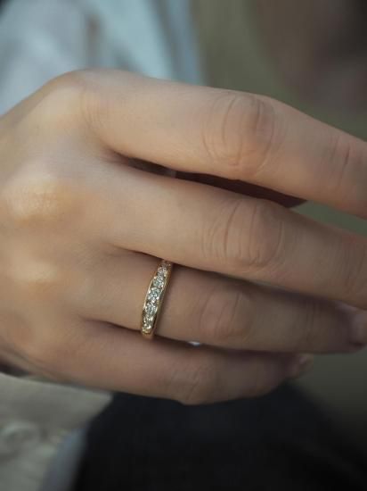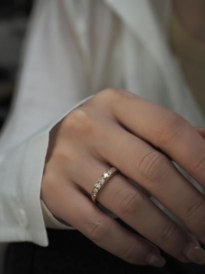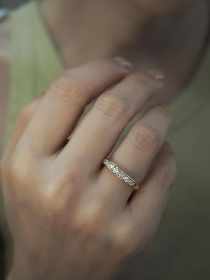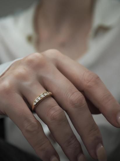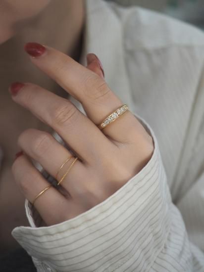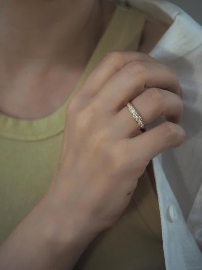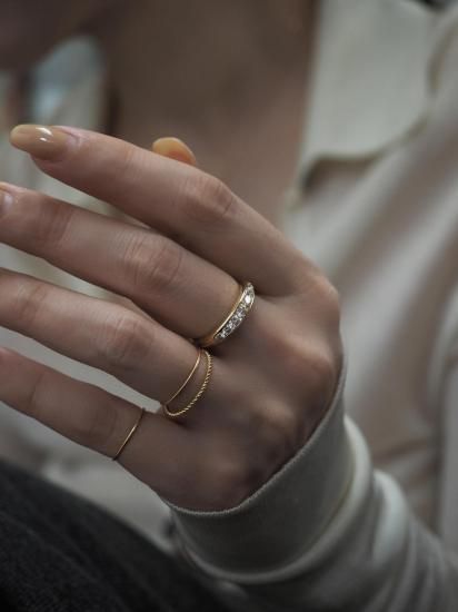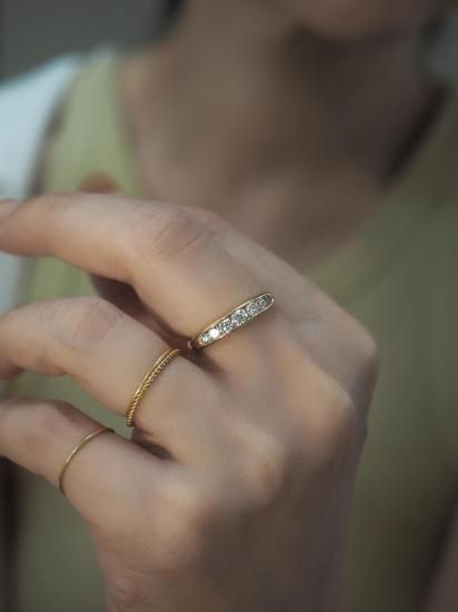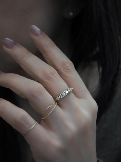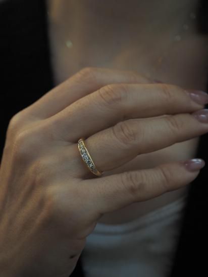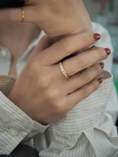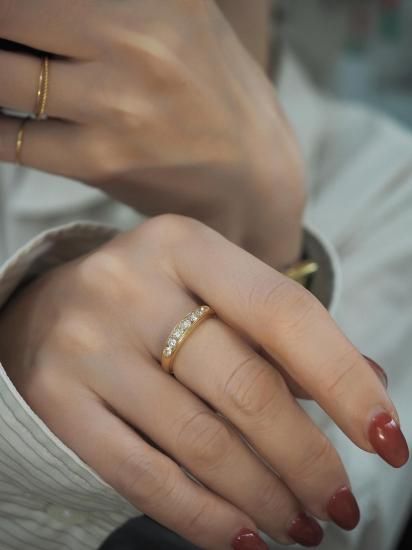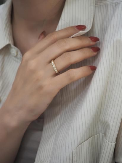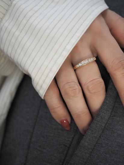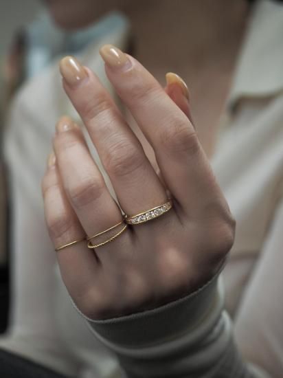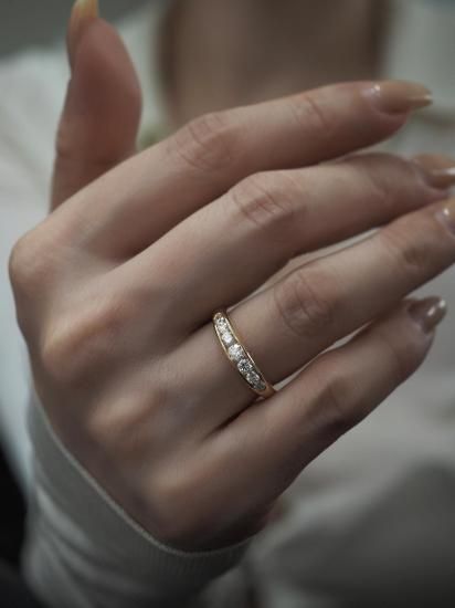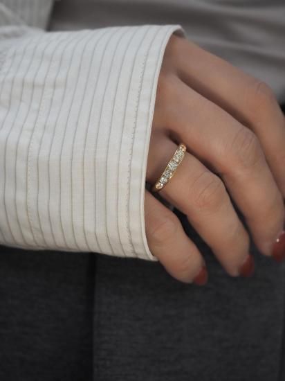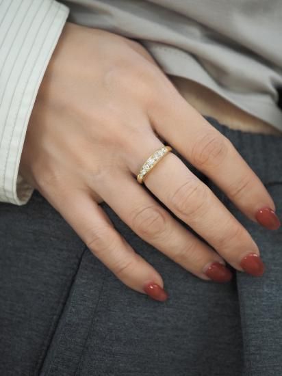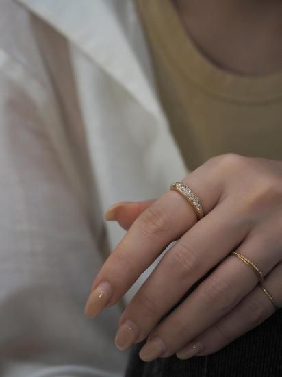 中心が一番大きく外側へグラデーションになるダイヤを贅沢にk18の枠で囲われた、ぽってり感がオシャレで存在感を増すデザインリングです。